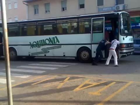 Trasporti disastrosi a Lamezia Terme, in Calabria: il bus è spinto dai passeggeri.