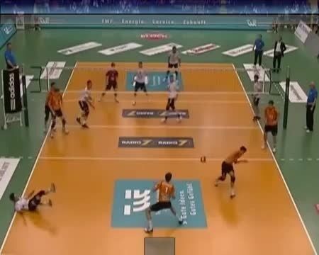 Partita di pallavolo, un giocatore effettua una schiacciata e incredibilmente con un solo colpo colpisce in sequenza la testa di tre avversari