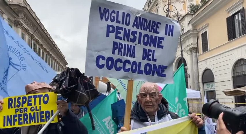 "Vogliamo lavorare meglio in un servizio sanitario migliore" Roma, 5 dic. (askanews) - Medici e infermieri da tutta Italia manifestano a Roma in una Piazza Santi Apostoli gremita, "per un servizio sanitario migliore" e "per lavorare meglio". Una protesta che coincide con lo sciopero nazionale del settore, con un'adesione dell'85% secondo i sindacati. Le sigle sindacali si sono presentate unite sul palco, da dove hanno chiesto al governo "un segnale di coraggio e speranza" insistendo sulla necessità di maggiori investimenti. Al centro della protesta la questione delle assunzioni e delle pensioni: "Non si possono continuare a investire soldi nel privato", hanno detto i rappresentanti sindacali, "non accettiamo che ci si chieda di lavorare oltre 60 ore a settimana per carenza di personale"