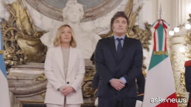 Saluti dal balcone con il presidente argentino Buenos Aires, 20 nov. (askanews) - La presidente del Consiglio Giorgia Meloni ha incontrato il presidente argentino Javier Milei che l'ha ricevuta alla Casa Rosada di Buenos Aires. La premier è stata accolta con una cerimonia di benvenuto dei militari all'esterno del palazzo presidenziale, poi ha avuto un colloquio con Milei e ha salutato la folla affacciandosi dal balcone insieme al presidente argentino. Per Meloni è il primo viaggio in America Latina dall'assunzione del suo incarico. La visita della presidente del Consiglio si concluderà con la partecipazione - alla presenza di rappresentanti delle istituzioni argentine e di una rappresentanza della collettività italiana - allo spettacolo "Luz, Càmara, Danza! Omaggio al grande cinema italiano" presso il Teatro Coliseo, l'unico teatro di proprietà dello Stato italiano al di fuori dei confini nazionali.