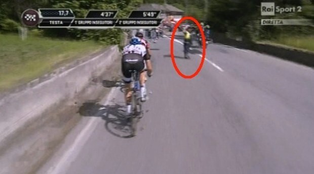 Nel corso della 14.a tappa che porta la carovana rosa da Aglie a Oropa, un addetto alla sicurezza è stato investito da una moto Rai. Le immagini vanno in diretta tv.