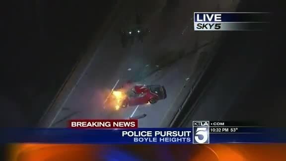 Los Angeles: Intorno alle 22.30 il canale televisivo KTLA durante il Tg della sera manda in onda un inseguimento della polizia in diretta tv. Una Ford Mustang nel tentativo di fuggire dagli agenti, sfreccia a tutta velocità sull'autostrada di Los Angeles, quando all'improvviso il conducente perde il controllo della sua auto sbattendo contro il guard rails. Nell'urto l'auto esplode trasformandosi in una palla di fuoco. I soccorsi sono riusciti a portare fuori dalla vettura l'uomo che è stato subito trasportato in ospedale.Attualmente le sue condizioni non sono ancora conosciute.