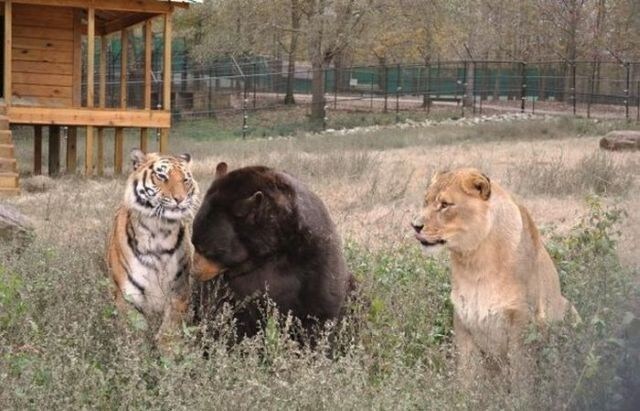 Una storia commovente arriva dagli USA e vede come protagonisti un orso, un leone e una tigre. I tre animali sono cresciuti insieme vivendo nell'abitazione di un narcotrafficante. Una volta arrestato il malvivente, i tre animali sono stati curati da un centro specializzato e successivamente sarebbero dovuti essere separati per evidenti motivi. I tre grossi predatori però, una volta divisi, hanno dato segnali e risposte negative così si è deciso di riavvicinarli per vedere se i feedback sarebbero diventati positivi. Così è stato, infatti il leone, la tigre e l'orso hanno iniziato a giocare nuovamente, proprio come quando erano cuccioli, senza accusare la differenza di specie.
