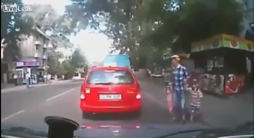 Un papà davvero molto sbadato, attraversa la strada con i figli ma si fa investire, perchè guarda dal lato sbagliato