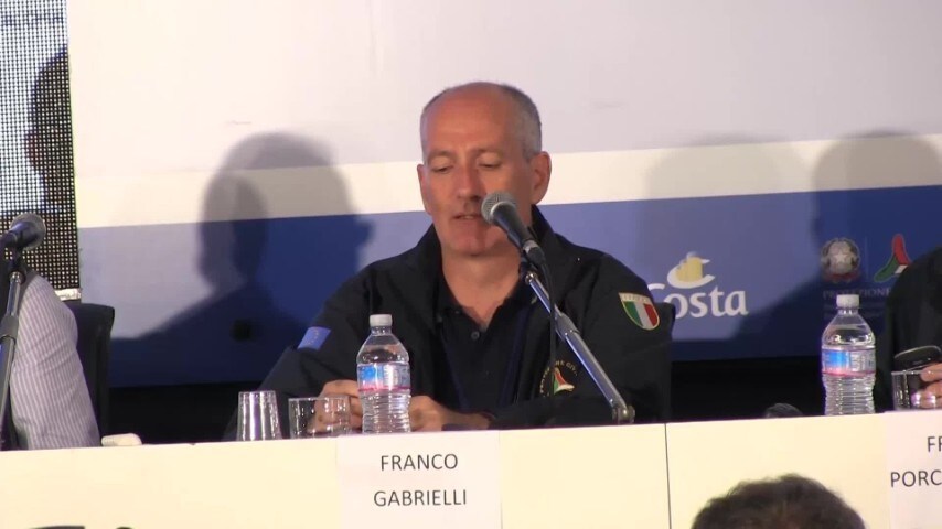 I responsabili del progetto di parbucling intervengono in conferenza stampa per annunciare l'inizio dell'ultima fase di rotazione della nave.