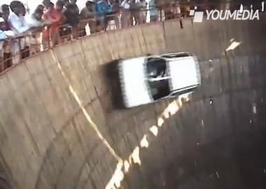 Succede in India, precisamente al The Diamond Maruti Car Circus nella città di Delhi, uno spettacolo molto particolare dove moto e auto girano su un muro a tutta velocità sfidando la forza di gravità