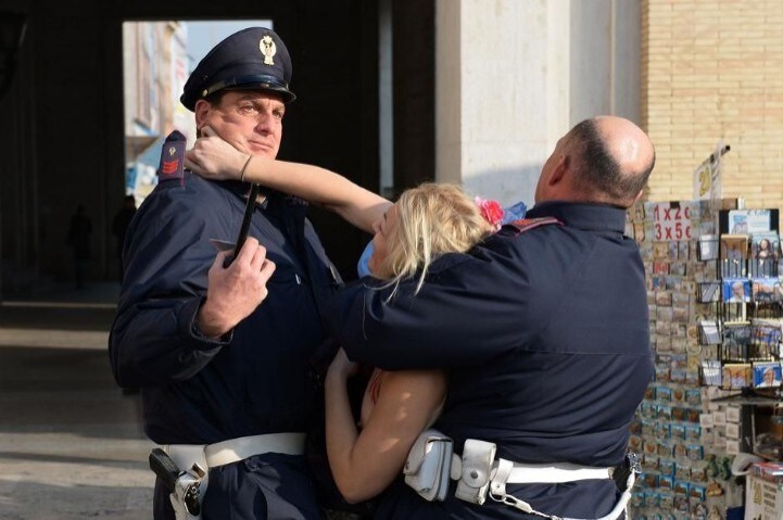 Un'attivista del movimento "Femen" ha protestato a seno nudo a piazza San Pietro, per la posizione della Chiesa cattolica sull'aborto. La donna, che ha urlato a più riprese lo slogan "il Natale è cancellato, Gesù è abortito", è stata fermata dalle forze dell'ordine nella piazza vaticana.L'attivista ha mostrato la scritta "abortion" in rosso sul braccio.