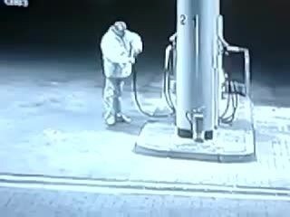 La telecamera a circuito chiuso di un distributore di benzina immortala uno strano soggetto che si avvicina alla pompa con un piccolo recipiente, lo riempie con qualche goccia di benzina e poi lo beve.