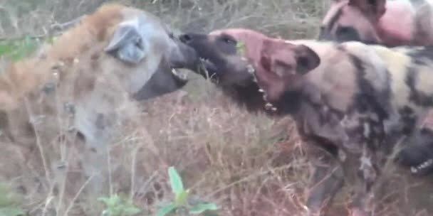 Se la vede davvero brutta questa iena al cospetto di un branco di cani selvatici che la circondano. Uno di questi le si attacca con un morso al naso e non se ne stacca più...