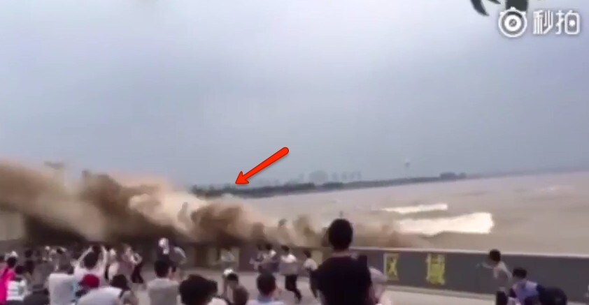 Una gigantesca onda che si è abbattuta con elevata forza sulle persone in strada. Si tratta di un fenomeno non rarissimo nella zona della foce del fiume Qiantang, in Cina. In particolari occasioni, quando cioè si forma una grande massa d'acqua marina che si dirige verso l'estuario del fiume (spinta dalla marea) e lo risale. Il fenomeno è detto mascheretto e può formare onde superiori ai 4 metri.