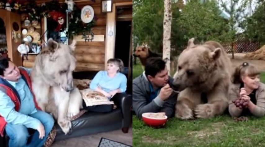 È stato salvato dopo che era rimasto orfano a soli tre mesi e sua mamma era stata uccisa dai cacciatori. Stepna, un orso bruno di 23 anni, è stato adottato da una famiglia russa, quasi si trattasse di un figlio. Secondo quanto racconta Yuriy Panteleenko, l'animale non ha mai mostrato segni di aggressività, tutt'altro. Ama coccolare ed essere coccolato, ama giocare e addirittura a pranzo e cena si siede a tavola con i suoi padroni.