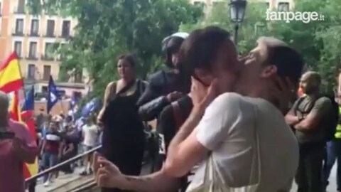 Una coppia di giovani gay sfida apertamente il corte neonazista che sfila lungo le strade di Madrid: i due si abbracciano e poi si baciano, un chiaro segno di protesta contro l'iniziativa dei manifestanti che di risposta iniziano a insultarli. Le immagini sono state postate da Esther Rubio su Facebook. Fonte video: https://www.facebook.com/esther.rrrubio?fref=photo