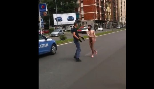 Un uomo completamente nudo è stato filmato a Milano, in viale Monza. La persona in questione, quando una pattuglia della Polizia in auto gli ha intimato di fermarsi, ha provato ad aggredire un agente che l'ha immobilizzato successivamente. Fonte: https://www.youtube.com/watch?v=YzLcDaCbigk