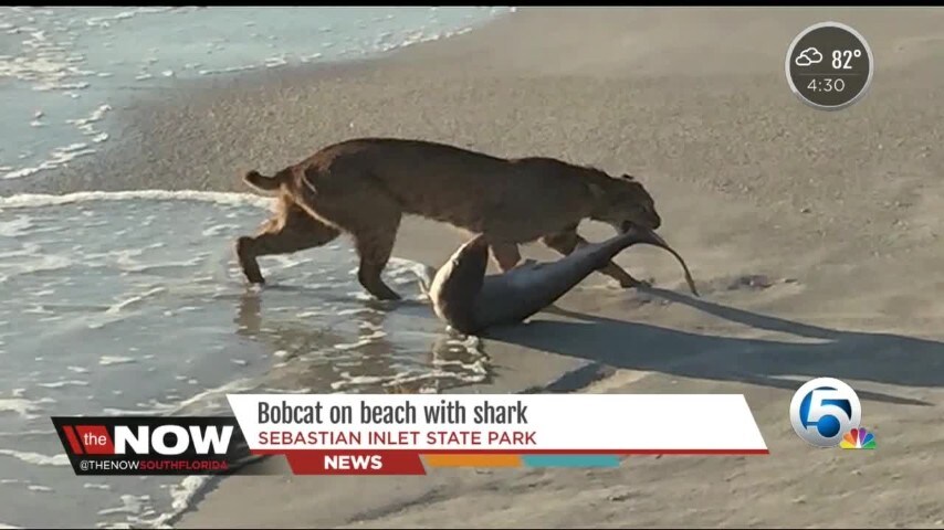 Caccia grossa per una lince rossa che, arrivata sulla spiaggia di Palm Beach in Florida, si tuffa in acqua per catturare qualche pesce. Il felino afferra per la coda uno squalo e lo porta via. Un'immagine immortalata da un utente che ha postato poi la foto su Instagram.