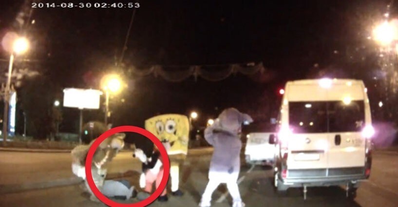 Queste immagini giungono dalla Russia: un automobilista si ferma e ha qualcosa da ridire ad un furgone che lo tallona: Dal veicolo scendono persone travestite da famosi pupazzi che iniziano a pestare l'uomo. Una scena ripresa dalla GoPro di un veicolo poco distante in cui si sentono le risate per la bizzarra scena.