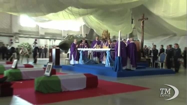 Messa funebre solenne per i quattro piloti morti nelle Marche, in un hangar all'aerobase militare del Sesto Stormo di Ghedi, in provincia di Brescia.A celebrarlo, il Mons. Santo Marcianò, che ha detto: "La passione che Mariangela, Alessandro, Giuseppe, Paolo Piero hanno vissuto e testimoniato non è semplicemente un desiderio da realizzare ma molto di più: chiede disponibilità, disciplina,dedizione, addestramento".