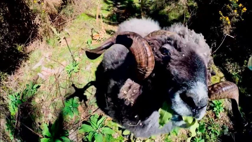 Un drone viene telecomandato nei pressi di un ariete il quale non manca di rifilare una bella testata all'oggetto volante mettendolo fuori uso. In queste immagini si vede anche la fase successiva in cui l'uomo si avvicina all'animale per recuperare l'oggetto.