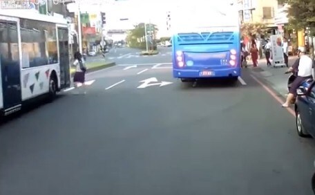 Taipei, Taiwan. Una ragazza attraversa la strada senza guardare alla sua destra e viene quasi investita dal pullman che procede senza fermarsi.
