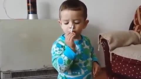 Bimbo di due anni imita i grandi e "fuma" una sigaretta