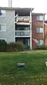 Conoscete un modo più geniale ed efficiente di trasportare un divano dal secondo piano senza usare le scale? Questo ragazzo mette su un sistema di corde ben teso e il divano viene giù che è una bellezza e neanche loro ci credono!!!