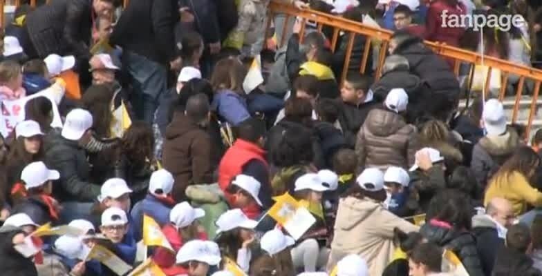 Appena sceso dalla "Papa Mobile", il Pontefice viene accolto dal Cardinale Sepe che lo saluta con il suo consueto: "A Maronna t'accumpagn",