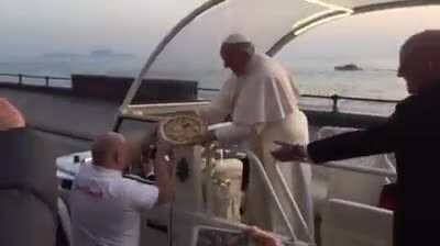 Sul lungomare di Napoli Papa Francesco viene accolto con una pizza da alcune persone che gliela consegnano direttamente sulla Papamobile e dopo esultano. Le immagini sono state caricate su Facebook dall'account di Roberto Viscardi ( Fonte: https://www.facebook.com/video.php?v=10153342241755769&set=vb.627945768&type=2&theater).