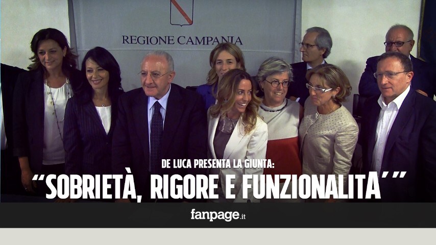 Vincenzo De Luca ha ufficialmente presentato la nuova giunta della Regione Campania nel pomeriggio a Palazzo Santa Lucia a Napoli. "Il consiglio regionale ha preso atto della elezione e solo oggi ho firmato i decreti di nomina" ha precisato De Luca in conferenza stampa. Il neo governatore ha sottolineato l'altra presenza di donne in giunta "caso unico in Italia" - ha detto - chiedendo alle componenti della sua squadra di alzare la mano dopo aver letto i loro nomi. Piccolo siparietto con l'assessore alla attività produttive Amedeo Lepore "uno dei due maschi in giunta, o almeno lo spero per lui" ha detto il presidente.
