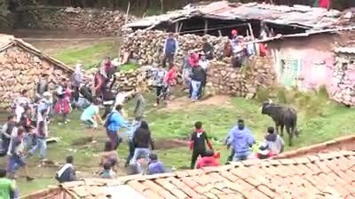 Almeno 8 feriti al tradizionale festival di Huancavelica, Peru, con l'annuale corrida. Il festival presuppone che i tori corrano liberi in un campo ma qualcosa va storto e l'animale si dirige verso il pubblico.Fonte Video: Edison Pineda Retamozo via Facebook