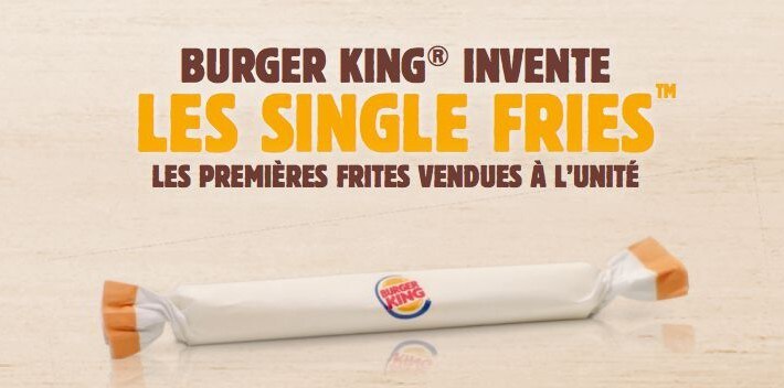 Burger King Francia ha lanciato "Single Fries, la patatina monoporzione, come provocazione ai suoi clienti che, anche quando sono sazi, non rinunciano alla porzione di patatine fritte compresa nel menù. Per evitare questo spreco, la nota catena di fast food ha voluto lanciare sul mercato questo prodotto, disponibile in tre versioni: medium, big, e king, da abbinare perfettamente ai panini, delle medesime dimensioni.Fonte: https://www.youtube.com/watch?v=mheyvx1kVJQ