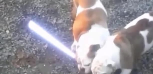 In pieno tema Star Wars: due bulldog si contendono una spada laser e qualcuno ha pensato bene anche di montare la colonna sonora.