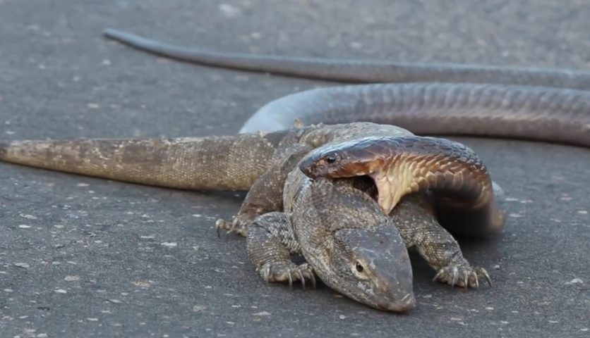 Il cobra snouted (cobra nasuto) è un serpente velenoso e altamente pericoloso. Eccolo alle prese con una lucertola gigante che cerca di resistere e di scappare, nonostante l'aggressività del rettile, le ferite sul collo e il veleno. Secondo la testimonianza dell'automobilista che ha ripreso la scena, la lucertola alla fine non ce l'avrebbe fatta a sopravvivere.
