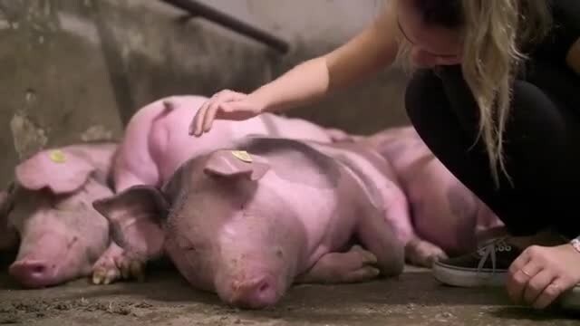 L'animalista Lena Elle Ella accarezza i maiali destinati al macello. La reazione degli animali è commovente: inizialmente spaventati, si lasciano coccolare per poi rilassarsi ed addormentarsi.