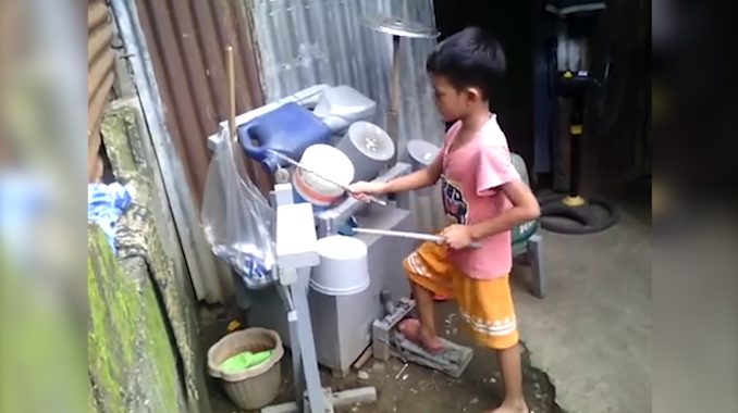 Bambino suona la batteria composta da secchi e contenitori di plastica: il talento è davvero straordinario