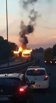 Il mezzo era vuoto, intervento dei vigili del fuoco, traffico paralizzato nella prima mattinata. Secondo l'azienda, il mezzo, alimentato a metano, era stato revisionato in giugno