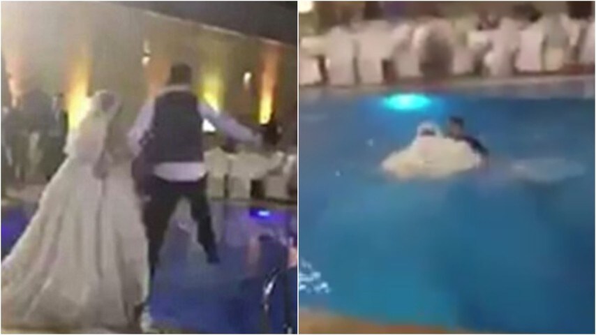 Doveva essere un gioco alla fine del matrimonio, ma stava per trasformarsi in tragedia. Le immagini arrivano da Beirut, capitale del Libano, dove due giovani sposi stavano festeggiando il loro matrimonio quando hanno deciso di tuffarsi in piscina con i loro vestiti. La sposa non ha calcolato il peso che poteva avere il suo vestito una volta bagnato e ha rischiato di annegare. Solo il marito ha subito capito la gravità e ha provato a tenerla a galla come poteva. La giovane si è salvata afferrando un'asta che qualcuno da bordo piscina ha allungato verso di lei, anche se è comunque molto strano che nessuno dei presenti ha deciso di tuffarsi in acqua per aiutarla.