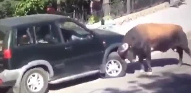 Paura per i passeggeri, toro infuriato incorna la macchina