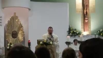 Don Severino Mondelli canta "Io Vagabondo" dei Nomadi durante la messa domenicale nella chiesa che si trova a San Corrado, in provincia di Piacenza. Durante l'omelia stupisce i fedeli intonando il famoso brano dei Nomadi. Le immagini sono state postate su Facebook da Massimo Alberici. Fonte video: https://www.facebook.com/MASSIMO75/videos/10212076608661417/