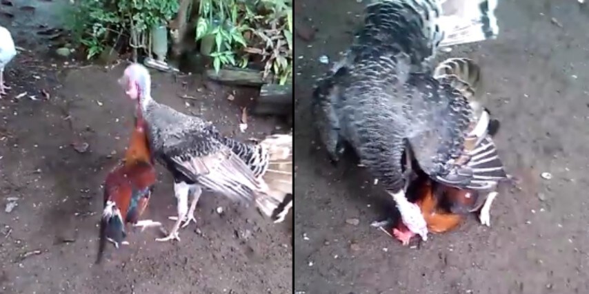 La scena filmata mostra il terribile scontro tra il gallo e un tacchino che, per natura, è di dimensioni più grandi del suo avversario. Questo vantaggio naturale, forse, segna l'esito finale del combattimento: il gallo non riesce a sventare gli attacchi del tacchino che, più volte, riesce a bloccarlo con la testa a terra.Fonte: https://www.youtube.com/watch?v=Okg7Cb6jOjk