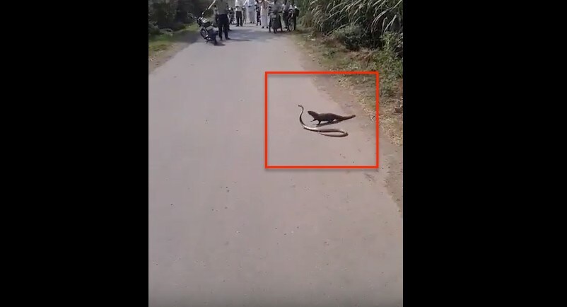 Escono dai cespugli e danno vita a uun lungo combattimento in strada. Si tratta di una mangusta contro un cobra indiano: alla fine la prima riesce ad avere la meglio e uccide il rettile.
