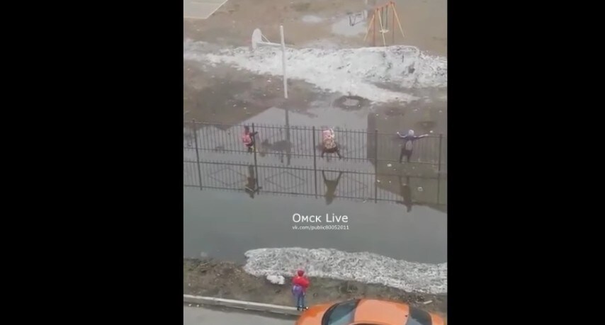 La strada è completamente allagata, questi bambini di una città russa devono superare in modo incredibile gli ostacoli: arrampicandosi alla cancellata vanno a scuola.