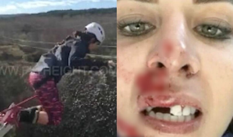 Bungee jumping a Madrid: la ragazza è pronta a lanciarsi nel vuoto ma qualcosa va storto e finisce con la faccia contro la scogliera. Una botta violenta che le procura la rottura di due denti e graffi al volto. A quanto la pare la corda si aggroviglia nel momento in cui la donna sta per partire. Fonte: Fly Height
