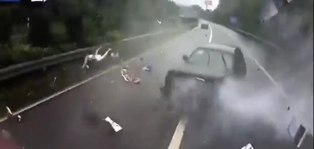 L'auto perde aderenza per colpa dell'asfalto bagnato, finisce contro le protezioni e si schianta. durante i testacoda, chi era al volante viene sbalzato dal finestrino dell'auto.