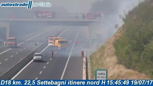Chiuso un tratto della diramazione Roma-Nord dell'Autostrada A1 per un incendio divampato all'altezza di Settebagni. Il traffico veicolare è stato bloccato dal chilometro 19 al chilometro 23. I vigili del fuoco, come si vede nelle immagini registrate dalla webcam di Autostrade, sono ancora al lavoro per spegnere l'incendio.Fonte: webcam Autostrade.it