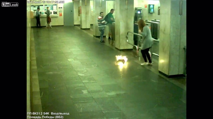 Il video è stato ripreso dalle telecamere di sorveglianza della stazione di Ploschad Pobedy a Minsk, capitale della Bielorussia. La donna cammina tranquillamente nella stazione quando accade l'impensabile: dalla borsa partono delle fiamme e prende fuoco tutto; la causa è la batteria della sigaretta elettronica difettosa. Un agente aiuta la donna spaventata dalla situazione, a spegnere il piccolo incendio.Fonte: https://www.liveleak.com/view?i=369_1500060183