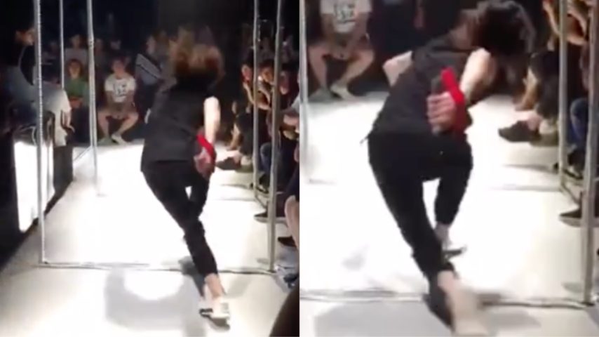 Scivola mentre sfila sulla passerella, ma invece di arrendersi alla sua caduta reagisce in modo sorprendente e improvvisa un ballo sulle note della musica elettronica di sottofondo: le immagini sono esilaranti.