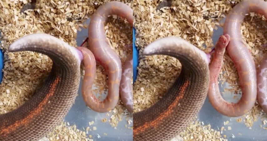 Nelle immagini della pagina Facebook dedicata 'Reptile Collective, un boa dà alla luce i suoi piccoli che vengono fuori dalla cloaca. Il video è diventato super virale e ha ottenuto oltre 9 milioni di visualizzazioni in pochi giorni. Fonte video: https://www.facebook.com/ReptileCollective/videos/1638404736170873/