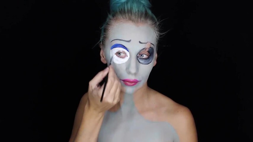 Con il body painting si può fare qualsiasi cosa, anche trasformarsi nella celebre 'Sposa Cadavere' di Tim Burton. L'esperta Mirjana Kika Milosevic, utilizzando uno sfondo nero, riesce a creare un'illusione ottica fantastica. Fonte video: https://www.youtube.com/watch?v=sMW6QxayKok