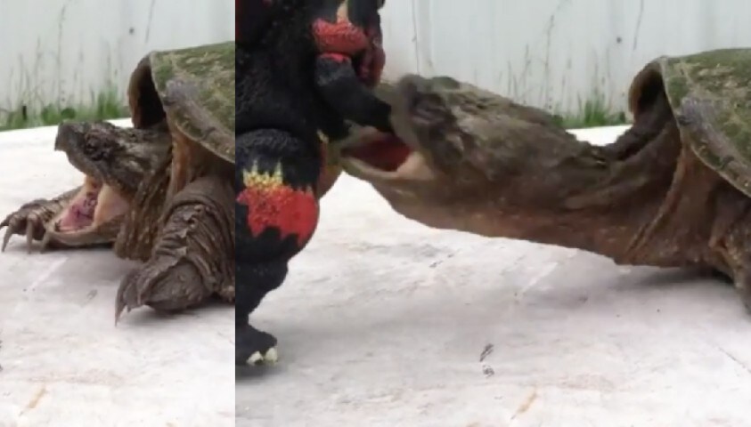 Alcuni ragazzi giocano con un Godzilla giocattolo e una tartaruga: il rettile fa uno scatto improvviso e morde "l'avversario"