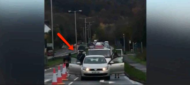 La disputa tra due automobilisti degenera in una rissa furibonda; le immagini provengono da Caerphilly, nel Galles. Gli uomini si prendono a pugni in mezzo alla strada, senza considerare la lunghissima coda di macchine alle loro spalle.