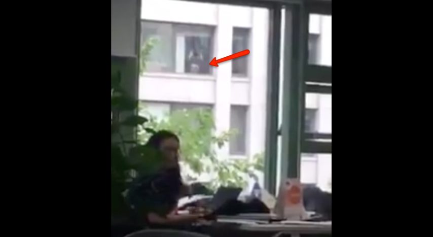 Assurde immagini dalla Cina. I lavoratori in ufficio vengono distratti da uno spettacolino sexy: una donna seminuda mostra il fondoschiena piazzata davanti alla finestra.